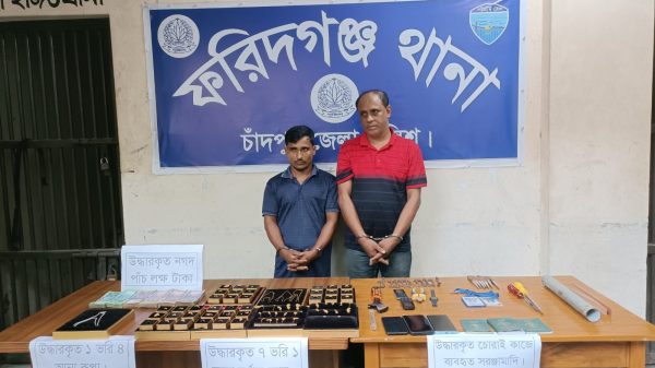 নারায়ন রবিদাস:ফরিদগঞ্জে উপজেলা সদরের ও থানার অদূরে মা জুয়েলার্সে চুরির ঘটনায় দুই চোরকে খুলনা ও চাঁদপুর থেকে আটক করেছে ফরিদগঞ্জ থানা পুলিশ। এসময় তাদের কাছ থেকে চুরি হওয়া স্বর্ণালংকার, ...বিস্তারিত পড়ুন