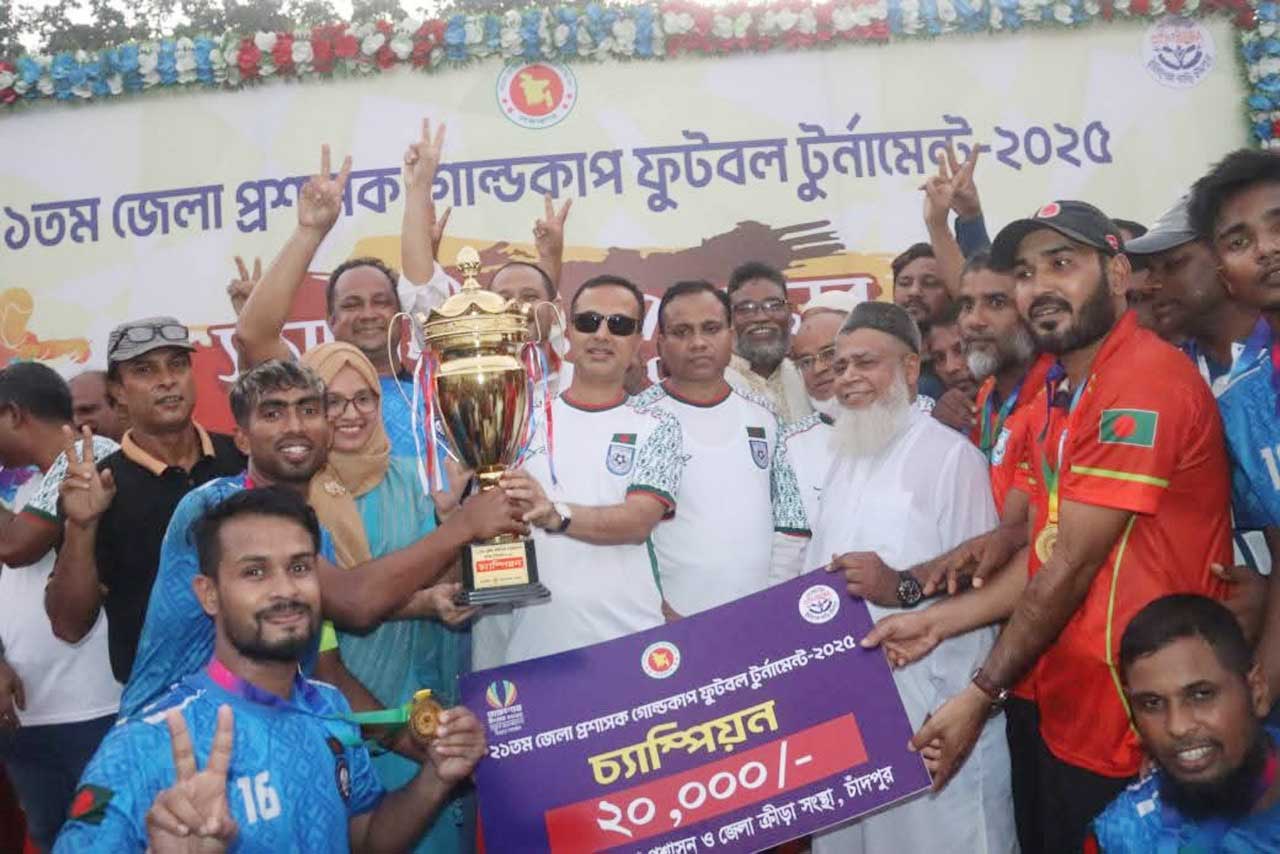 নিজস্ব প্রতিনিধি ॥ চাঁদপুর স্টেডিয়ামে বর্ণাঢ্য আয়োজনে সম্পন্ন হয়েছে ২১তম জেলা প্রশাসক গোল্ডকাপ ফুটবল টুর্নামেন্ট-২০২৫ এর ফাইনাল ম্যাচ। নির্ধারিত সময়ে গোলশূন্য থাকার পর রোমাঞ্চকর টাইব্রেকারে ফরিদগঞ্জ উপজেলা ক্রীড়া সংস্থাকে ৪-৩ গোলে পরাজিত করে চ্যাম্পিয়ন হয় মতলব উত্তর উপজেলা ক্রীড়া সংস্থা দল।শনিবার (১৮ অক্টোবর) বিকেল সাড়ে ৩ মতলব উত্তর উপজেলা ও ফরিদগঞ্জ উপজেলা ক্রীড়া সংস্থা দলের মধ্যে খেলা শুরু হয়।ফাইনাল ম্যাচে অসাধারণ পারফরম্যান্সের জন্য ম্যান অব দ্য ম্যাচ এবং টুর্নামেন্টের সেরা গোলরক্ষক নির্বাচিত হন মতলব উত্তরের খেলোয়াড় মো. সাকিব হোসেন। অপরদিকে দুই গোল করে সর্বোচ্চ গোলদাতার পুরস্কার অর্জন করেন ফরিদগঞ্জের তারিকুল ইসলাম। পুরো টুর্নামেন্টে ধারাবাহিক দক্ষতার কারণে সেরা খেলোয়াড় নির্বাচিত হন মতলব উত্তরের মো. ওমর সানি মুন্সী। জেলার ৮ উপজেলার অংশগ্রহণে আয়োজিত এই টুর্নামেন্টে ছিল খেলোয়াড়দের দুর্দান্ত পারফরম্যান্স ও দর্শকদের প্রাণবন্ত উপস্থিতি। ফাইনাল খেলায় স্টেডিয়াম ছিল দর্শকে পরিপূর্ণ। প্রায় দশ হাজারেরও বেশি ফুটবলপ্রেমী ম্যাচটি উপভোগ করেন উৎসবমুখর পরিবেশে।