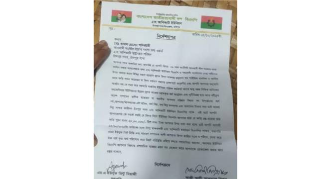 নির্দেশনাপত্র শিরোনামে ওই চিঠিতে ইউনিয়নের ৭নম্বর ওয়ার্ড ইউপি সদস্য মো. কামাল হোসেন পাটওয়ারীর কাছে ২০লাখ টাকা দাবী করা হয় এবং ২৫ অক্টোবরের মধ্যে ওই টাকা সভাপতি ও সাধারণ সম্পাদকের নিকট পরিশোধ করার জন্য বলা হয়।