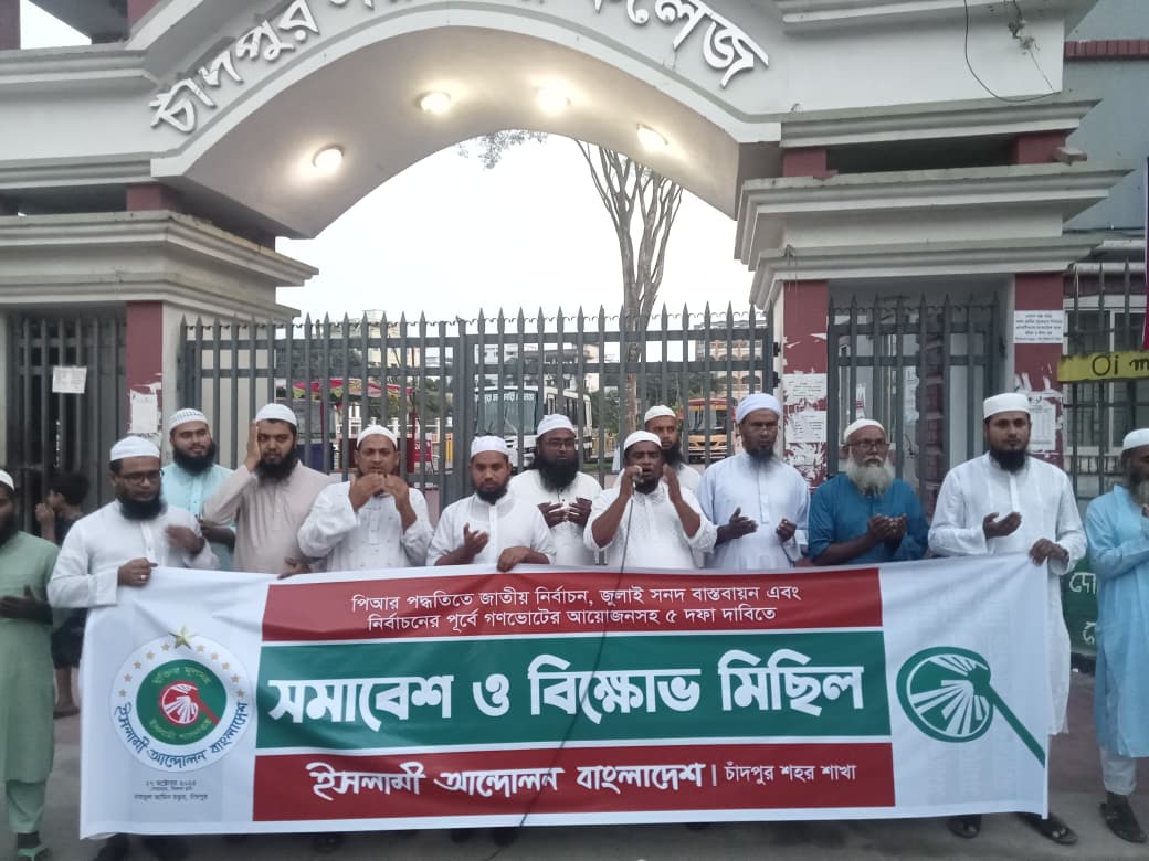 বিশেষ প্রতিনিধিঃ আগামী জাতীয় নির্বাচনের আগে জুলাই সনদ বাস্তবায়ন, তার ওপর গণভোট আয়োজন, নির্বাচনে উভয় কক্ষে পিআর পদ্ধতি চালু, সকলের জন্য লেভেল প্লেয়িং ফিল্ড নিশ্চিত, ফ্যাসিস্ট সরকারের জুলুম-নির্যাতন ও দুর্নীতির বিচার এবং জাতীয় পার্টি ও ১৪ দলের কার্যক্রম নিষিদ্ধের দাবিতে ইসলামী আন্দোলন বাংলাদেশ চাঁদপুর শহর শাখার উদ্যোগে সোমবার বিকেল ৪টায় শহরের বিপণীবাগ জেলা কার্যালয়ের সামনে বিক্ষোভ মিছিলপূর্ব সমাবেশ অনুষ্ঠিত হয়।