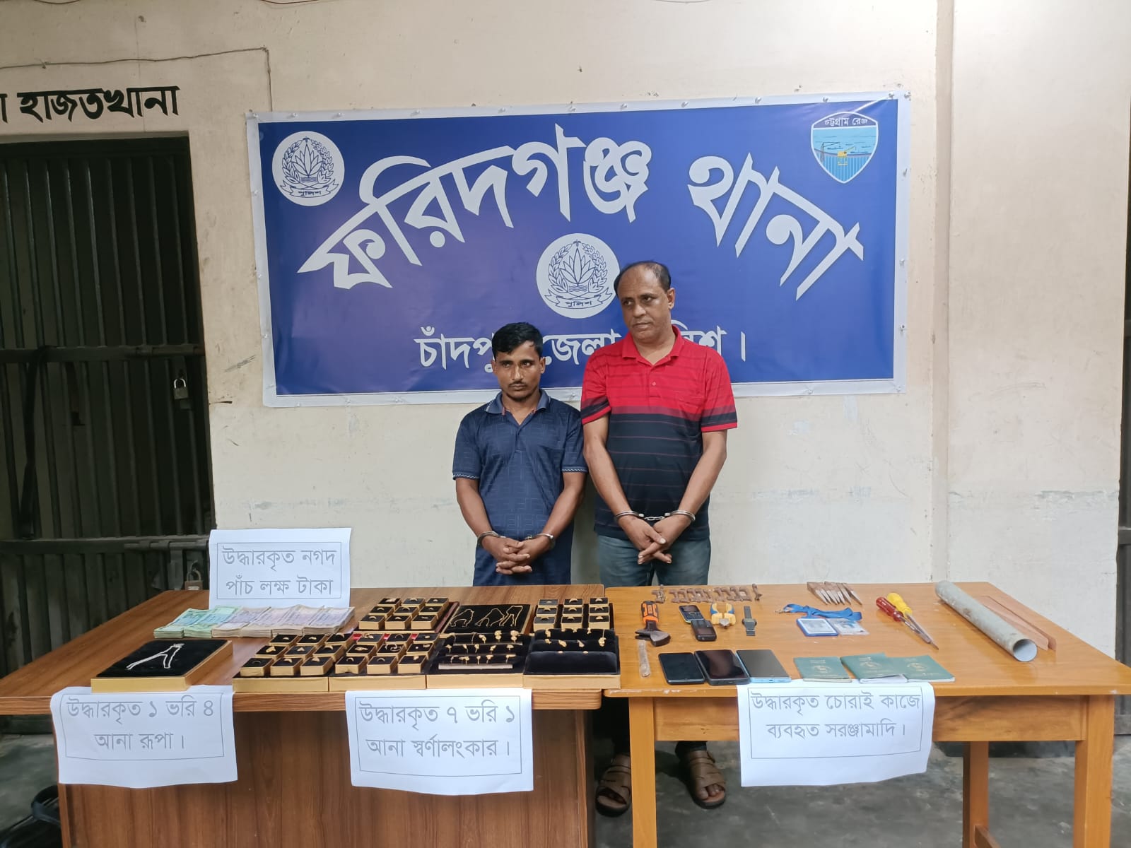 জানা গেছে, ফরিদগঞ্জ উপজেলা সদরের থানার অদূরে মা জুয়েলার্সে গত ১৫ অক্টোবর রাতে চুরির ঘটনা ঘটে। চোরের দল দোকানের সাটার ভেঙ্গে দোকানে প্রবেশ করে সিসি ক্যামেরা ভেঙ্গে ফেলে। পরে দোকানের সিন্দুক ভেঙ্গে স্বর্ণালংকার চুরি করে পালিয়ে যায়। এঘটনায় ফরিদগঞ্জ থানায় মামলা দায়ের হলে পুলিশ তথ্য প্রযুক্তি ব্যবহার করে প্রথমে খুলনা জেলা সদরের নিরালা আবাসিক এলাকা থেকে ২৯ অক্টোবর বুধবার সকালে কামাল পারভেজ মিলন(৪৬)কে ও তার সহযোগি মোঃ খলিল মৃধা(৪০)কে একইদিন চাঁদপুর জেলা সদরের এলায়েতনগর এলাকা থেকে আটক করে। এসময় তাদের কাছ থেকে চুরি হওয়া প্রায় সাত ভরি স্বর্ণালংকার, চুরি হওয়া স্বর্ণালংকার বিক্রির নগদ পঁাচ লক্ষ টাকা ও চোরাই কাজে ব্যবহৃত সরঞ্জামাদি উদ্ধার করা হয়। আটককৃত কামাল পারভেজ মিলন সাতক্ষীরা জেলার আশাশুনি থানার ফিরোজপুর গ্রামের ইসমাইল সরদার ওরফে আলী হোসেন’র ছেলে ও খলিল মৃধা পিরোজপুর জেলার ইন্দুরকান্দি উপজেলার দক্ষিণ ইন্দুকান্দি গ্রামের নেছার উদ্দিন মৃধা’র ছেলে। পুলিশ জানায়, কামাল পারভেজ মিলনের বিরুদ্ধে ডাকাতির প্রস্তুতিসহ ৭টি মামলা ও খলিলের বিরুদ্ধে দুইটি সিআর মামলা রয়েছে। এব্যাপারে পুলিশ বৃহস্পতিবার দুপুরে চাঁদপুর জেলা পুলিশ সুপার কার্যালয়ে প্রেস ব্রিফিং করে।