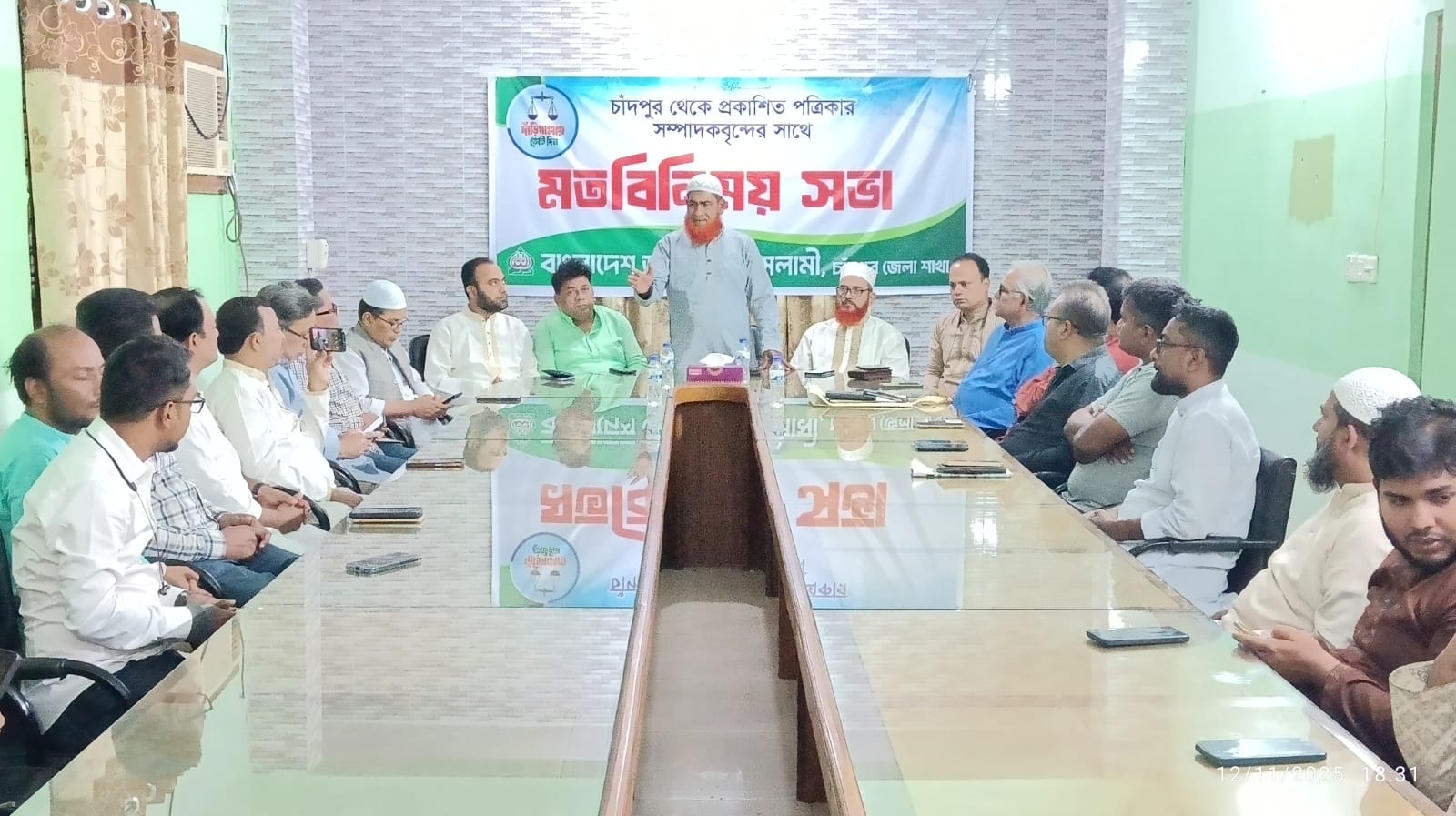 তিনি সাংবাদিকদের উদ্দেশ্যে করে বলেন, এখন কোন নির্বাচিত সরকার নেই। অন্তর্বর্তী সরকারের এই সময় আপনাদের লেখার সুযোগ রয়েছে। সমাজের সকল অসঙ্গতি নিয়ে এখন লিখতে পারেন। এক্ষেত্রে যে কোন সমস্যায় সাংবাদিকদের পাশে থাকবে বাংলাদেশ জামায়াতে ইসলামী। আইনের শাসন, ন্যায় বিচারসহ সকল সত্য ও ভালো কাজের সাথে আমরা আছি এবং থাকবো।মতবিনিময়ে অংশ নিয়ে বক্তব্য দেন চাঁদপুর প্রেসক্লাবের সভাপতি (ভারপ্রাপ্ত) সোহেল রুশদী, সাধারণ সম্পাদক কাদের পলাশ, দৈনিক চাঁদপুর কণ্ঠ পত্রিকার সম্পাদক কাজী শাহাদাত, দৈনিক চাঁদপুর প্রতিদিন পত্রিকার প্রকাশক ও সম্পাদক ইকবাল হোসেন পাটোয়ারী, দৈনিক মেঘনা বার্তা পত্রিকার সম্পাদক গিয়াস উদ্দিন মিলন, দৈনিক চাঁদপুর দর্পণ পত্রিকার ভারপ্রাপ্ত সম্পাদক শরীফ চৌধুরী, প্রভাতী কাগজ পত্রিকার সম্পাদক ও প্রকাশক আব্দুল আওয়াল রুবেল, দৈনিক চাঁদপুর সংবাদ পত্রিকার প্রকাশক ও সম্পাদক আব্দুর রহমান, দৈনিক চাঁদপুর প্রবাহের সিনিয়র বার্তা সম্পাদক আল-ইমরান শোভন, সাপ্তাহিক চাঁদপুর সকাল পত্রিকার প্রকাশক ও সম্পাদক অধ্যাপক মোশাররফ হোসেন লিটন। দৈনিক প্রিয় চাঁদপুর পত্রিকার প্রকাশক ও সম্পাদক বোরহান উদ্দিন ডালিম, দৈনিক সুদীপ্ত চাঁদপুর পত্রিকার ভারপ্রাপ্ত সম্পাদক এম.আর. ইসলাম বাবু, দৈনিক চাঁদপুর পত্রিকার ভারপ্রাপ্ত সম্পাদক কেএম মাসুদ, দৈনিক আদি বাংলা পত্রিকার ভারপ্রাপ্ত সম্পাদক ইমরান হোসেন রাজন, দৈনিক চাঁদপুর সময় পত্রিকার প্রধান সম্পাদক ফরিদ উদ্দিন উকিল সহ স্থানীয় দৈনিক পত্রিকার বিভিন্ন পর্যায়ের সাংবাদিকরা এ সময় উপস্থিত ছিলেন।জেলা জামায়াতের প্রচার সেক্রেটারী ও শহর জামায়াতের আমির অ্যাডভোকেট মো. শাহাজান খান, সদর উপজেলা আমির মাওলানা আফসার উদ্দিন মিয়াজী, শহর জামায়াতের সহকারী সেক্রেটারি মো. সবুজ খান, শহর ছাত্রশিবিরের সভাপতি মো. জাহিদুল ইসলাম, জেলা ছাত্রশিবিরের সভাপতি মো. ইব্রাহীম খলিলসহ সংগঠনের অন্যান্য নেতারা এ সময় উপস্থিত ছিলেন।
