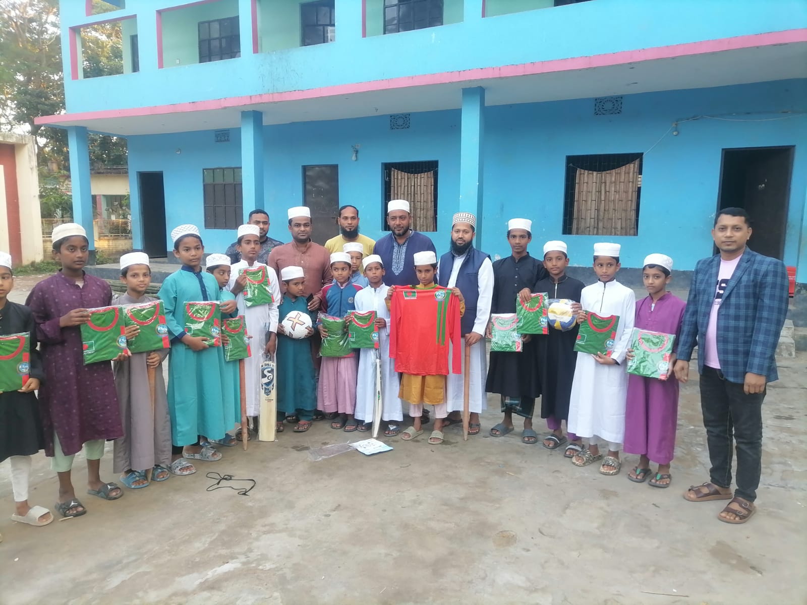 এতিম শিশুদের মাঝে ফুটবল ক্রিকেট ব্যাট স্ট্যাম ও জার্সি সহ খেলাধুলার সরঞ্জাম উপহার দেওয়া হয়।
