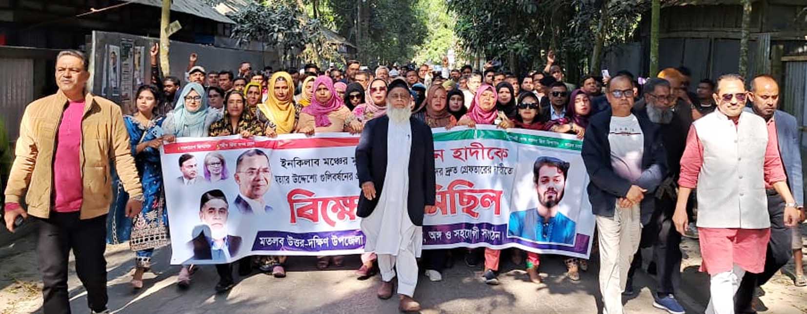 আরাফাত আল-আমিন : ইনকিলাব মঞ্চের মুখপাত্র ওছমান হাদির উপর গুলি বর্ষন করে হত্যাচেষ্টার প্রতিবাদে চাঁদপুরের মতলব উত্তরে এক প্রতিবাদ মিছিল ও বিক্ষোভ সমাবেশ অনুষ্ঠিত হয়েছে। শনিবার দুপুরে লুধুয়া আঞ্চলিক মহাসড়কে এ প্রতিবাদ মিছিলে নেতৃত্ব দেন বিএনপির জাতীয় নির্বাহী কমিটির সদস্য আলহাজ্ব ড. মোহাম্মদ জালাল উদ্দিন। প্রতিবাদ মিছিলটি লুধুয়া থেকে শুরু হয়ে নয়াকান্দি বাজারে গিয়ে শেষ হয় হয়। পরে বিক্ষোভ সমাবেশে প্রধান অতিথি হিসেবে প্রতিবাদ জানিয়ে বক্তৃতা ড. জালাল উদ্দিন। এসময় তিনি বলেন, জাতীয় নির্বাচনের তফসিল ঘোষণার পর এ ধরনের ঘটনা নির্বাচন বানচালের চেষ্টা করছে। তা আর হতে দেয়া যাবে না। যারা ওছমান হাদীকে গুলি করেছে, তারা অবশ্যই ফ্যাসিস্টের দোসর। তাই আমি প্রশাসনের কাছে অনুরোধ করবো দ্রুত সেই অপরাধীদের গ্রেফতার করে আইনের আওতায় এনে সর্বোচ্চ শাস্তির ব্যবস্থা করুন। ড. জালাল আরো বলেন, হাদিকে গুলি করা মানে আমাদের সবাইকে গুলি করা। সুতরাং এ ধরনের ন্যাক্কারজনক ঘটনা আমরা মানতে পারি না। আমাদের নেতা তারেক রহমান আগামী ২৫ ডিসেম্বর দেশে আসছেন। আমরা তার নেতৃত্বে আগামী দিনে সন্ত্রাসমুক্ত বাংলাদেশ গড়তে আমরা অঙ্গীকারবদ্ধ। আরো উপস্থিত ছিলেন, কেন্দ্রীয় স্বেচ্ছাসেবক দলের সাবেক সহ-সভাপতি আজহারুল হক মুকুল, কেন্দ্রীয় কৃষকদলের যুগ্ম সাধারণ সম্পাদক ব্যারিস্টার ওবাইদুর রহমান টিপু, কেন্দ্রীয় যুবদলের সাবেক যুগ্ম সাধারণ সম্পাদক জিয়াউর রহমান জিয়া, মতলব উত্তর উপজেলা বিএনপির সাবেক সাধারণ সম্পাদক আলমগীর সরকার, সহ-সভাপতি এসএম জাহাঙ্গীর আলম, ছেংগারচর পৌর বিএনপির সভাপতি নান্নু মিয়া, সাধারণ সম্পাদক জাহাঙ্গীর আলম প্রধান, উপজেলা বিএনপির সাংগঠনিক সম্পাদক মিয়া মনজুর আমিন স্বপন, তোফায়েল পাটোয়ারী, ক্রীড়া বিষয়ক সম্পাদক মেহেদী হাসান ইমু, বন ও পরিবেশ বিষয়ক সম্পাদক শাহাদাত হোসেন ভুইয়া, মৎস্য বিষয়ক সম্পাদক মহিন সরকার, উপজেলা যুবদলের ভারপ্রাপ্ত আহ্বায়ক রাশেদ জামান টিপু, সিনিয়র যুগ্ম আহ্বায়ক ফয়সাল আহমেদ, যুগ্ম আহ্বায়ক আঃ মান্নান সাগর, মোশারফ হোসেন মুরাদ, সদস্য ফরহাদ হোসেন, উপজেলা ছাত্রদলের আহ্বায়ক নুরুল হুদা ফয়েজী, উপজেলা স্বেচ্ছাসেবক দলের সভাপতি শাহজালাল প্রধান, যুগ্ম আহ্বায়ক মফিজুল ইসলাম শান্ত, উপজেলা শ্রমিক দলের সভাপতি আঃ মালেক মোল্লা, সাধারণ সম্পাদক নাছির উদ্দিন মৃধা, উপজেলা মহিলা দলের সভাপতি ফারজানা সরকার, যুগ্ম সাধারণ সম্পাদক আমেনা বেগম, ফতেপুর পুর্ব ইউনিয়ন যুবদলের সভাপতি মাইনুদ্দিন, সহ-সভাপতি জসিম উদ্দিন, ছেংগারচর পৌর ৬নং ওয়ার্ড যুবদলের সভাপতি সালামত মিয়াজি সহ শত শত নেতাকর্মী।