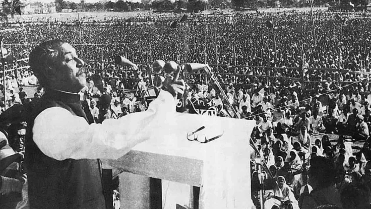 সেদিন বিকেল ৩টা ২০ মিনিটে সাদা পায়জামা-পাঞ্জাবি আর হাতাকাটা কালো কোট পরে বঙ্গবন্ধু দৃপ্ত পায়ে উঠে এলেন মঞ্চে। দাঁড়ালেন মাইকে সামনে। আকাশ-কাঁপানো স্লোগান আর মুহুর্মুহু করতালির মধ্যে হাত নেড়ে অভিনন্দন জানালেন অপেক্ষমাণ জনসমুদ্রের উদ্দেশে। তার পর শুরু করলেন তাঁর ঐতিহাসিক ভাষণ।
