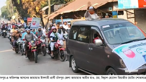 বিশেষ প্রতিনিধি ॥ দেড় সহস্রাধিক বাইকে নেতাকর্মীদের অংশগ্রহনে শোভা যাত্রা করেছে চাঁদপুর-৪ ফরিদগঞ্জ আসনের বাংলাদেশ জামায়াত ইসলামী মনোনীত প্রার্থী ও জেলা জামায়াতের আমির মাওলানা মো. বিল্লাল হোসেন মিয়াজী। শনিবার (২২